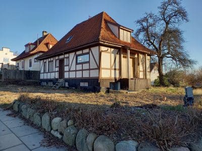 Der architektonische Ausdruck kann als Nationalromantik bezeichnet werden und war in den ersten 20-30 Jahren des 20. Jahrhunderts in mehreren Wohnvierteln zu sehen. Jahrhunderts in mehreren Wohnvierteln zu sehen. Es heißt, dass das Bauen mit Fachwerkfassaden Prestige bedeutete, da es relativ teuer war. Resenvej 1 ist also ein spätes Beispiel für ein Haus mit Fachwerkausdruck.